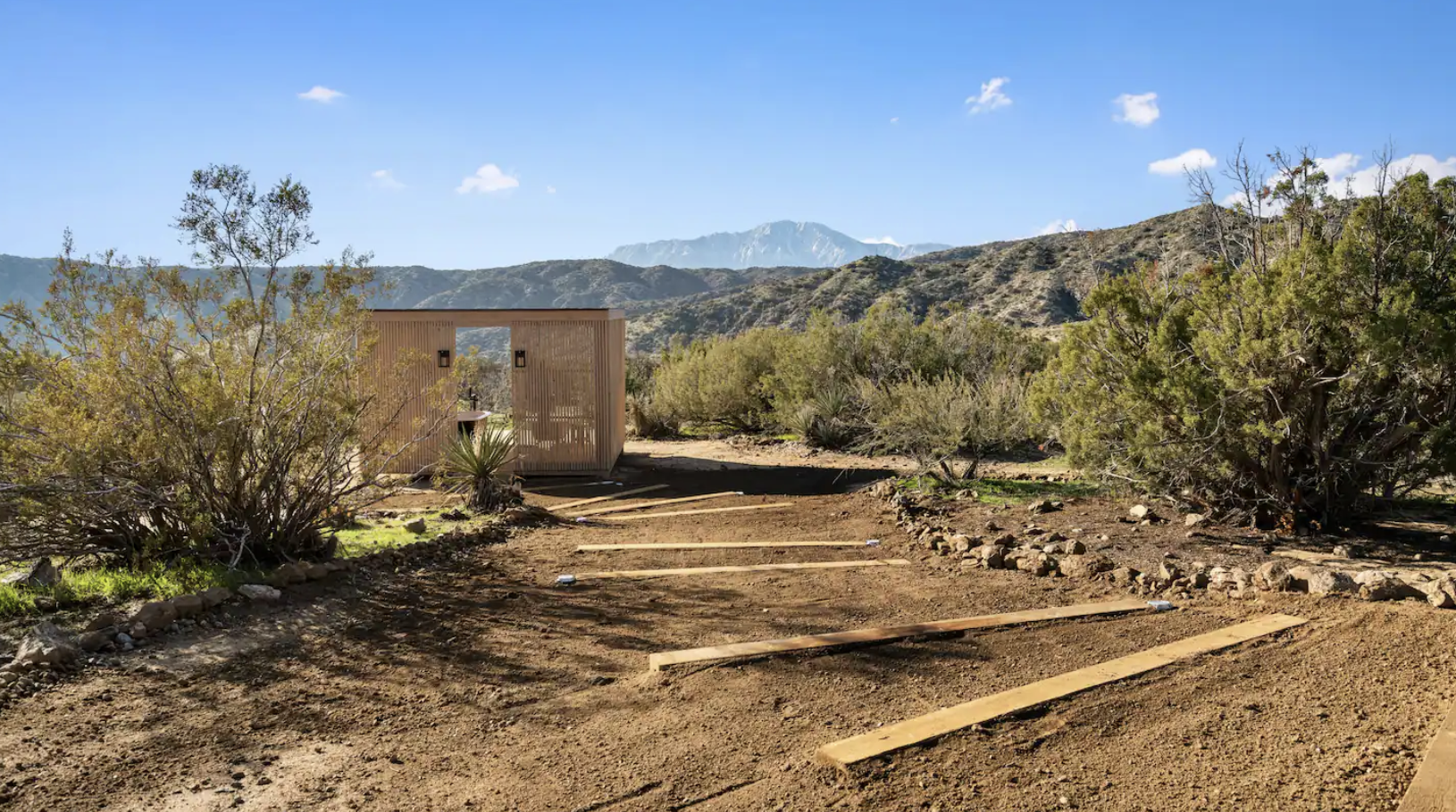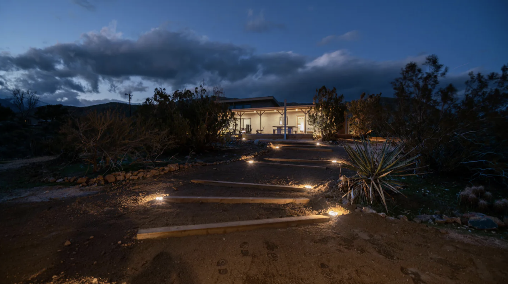 A full scale Landscape Design + Build in Morongo Valley, CA. We completely transformed this landscape with a custom bathhouse, pavers, corrugated & wood privacy screens, plants, trees, irrigation, pathways, and more! Contact Us Today!